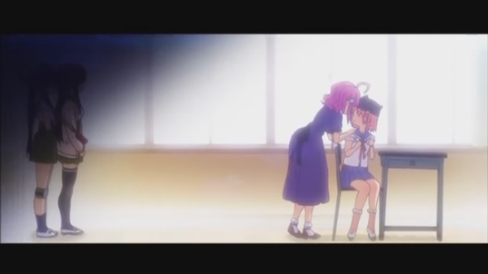 ・窓の外を見て真顔になるくるみと、窓の外を見ても笑顔を絶やさないゆきを対比させると、やはりゆきのほうが重病。ただやはり、学園内の普段の様子から鑑みるに、くるみも現実逃避組だろう